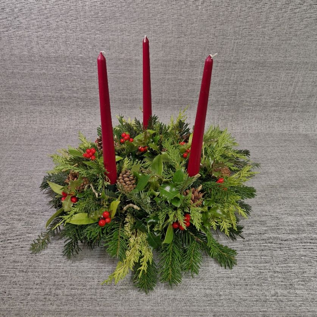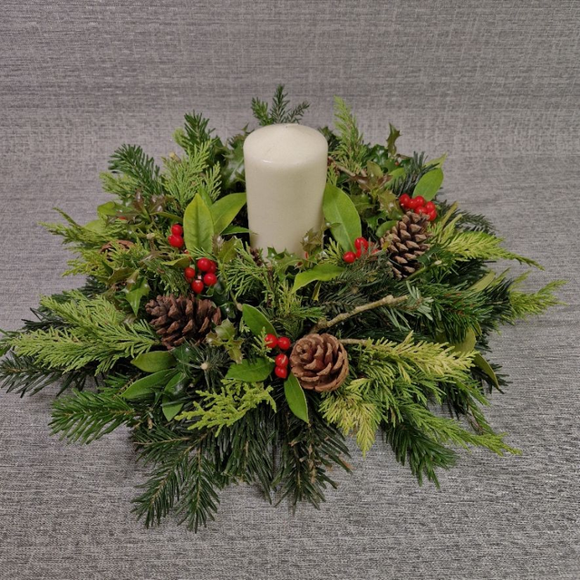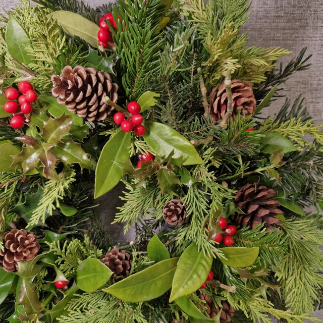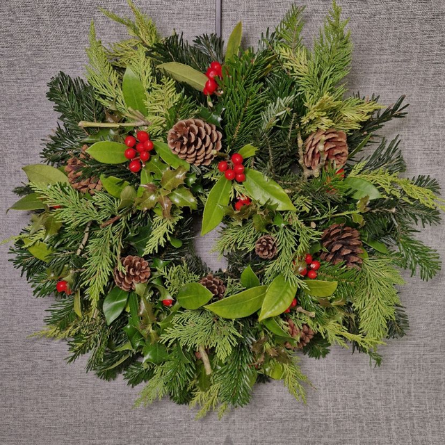 Enhance your festive décor with this stunning fresh foliage Christmas wreath, perfect as a traditional door decoration or a charming Christmas table centrepiece. Expertly crafted with fresh spruce, conifer, skimmia and holly, this wreath brings natural beauty and refreshing greenery to your Christmas celebrations. Its vibrant, seasonal ingredients are thoughtfully arranged to last throughout the festive season, adding warmth and elegance to any setting. If you want to use it as a table centre, you can also personalise it with candles or pine cones for an extra festive touch. This arrangement measures approximately 52cm. Please note, this is available for collection only.