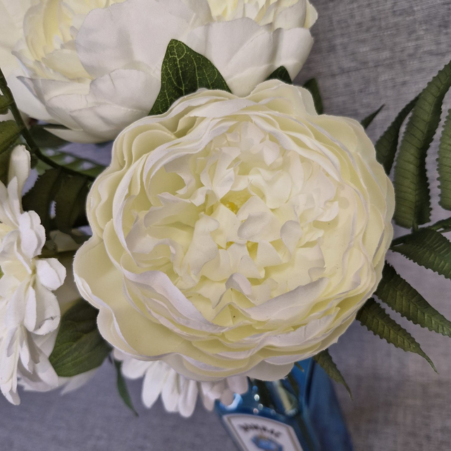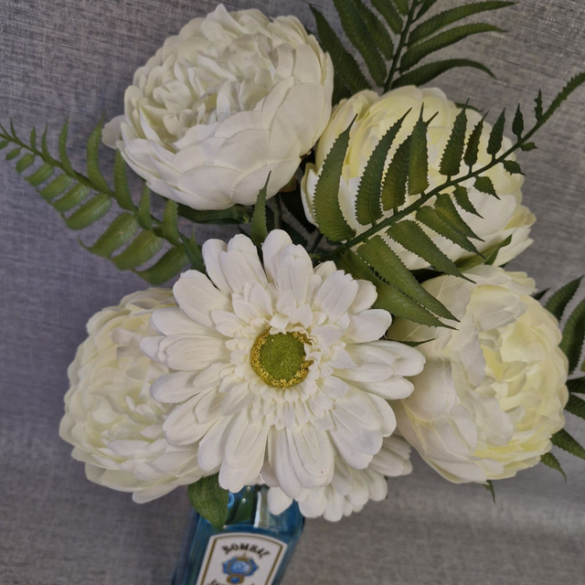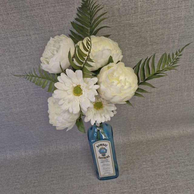 Celebrate the perfect blend of elegance and charm with this unique faux flower arrangement, ideal for anyone who loves gin and flowers. Featuring gorgeous white gerberas, cream peonies, and lush eucalyptus beautifully arranged in a signature Bombay Sapphire Gin bottle (no gin included!), this front-facing design stands approximately 66cm tall and 30cm wide. Crafted as a stunning home décor piece, it’s perfect for brightening up your bookcase, shelf, or any wall-adjacent space. This original design by Flaire – Flowers by Claire offers a chic, maintenance-free floral display that makes an unforgettable gift or a stylish statement for your own space.