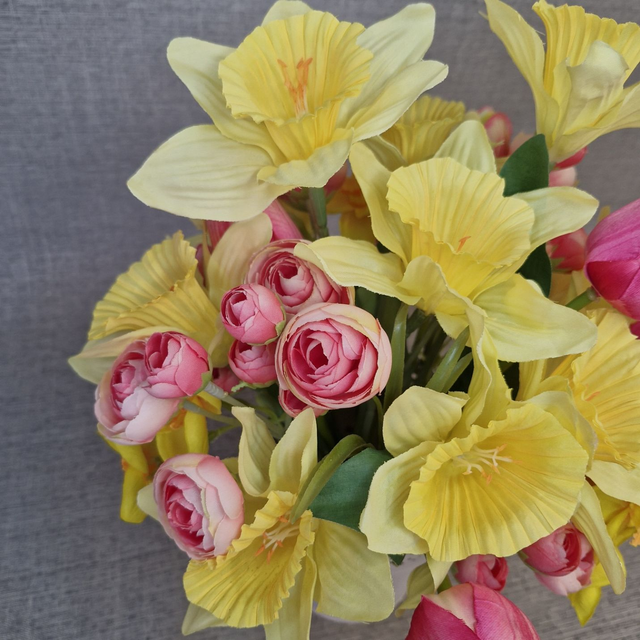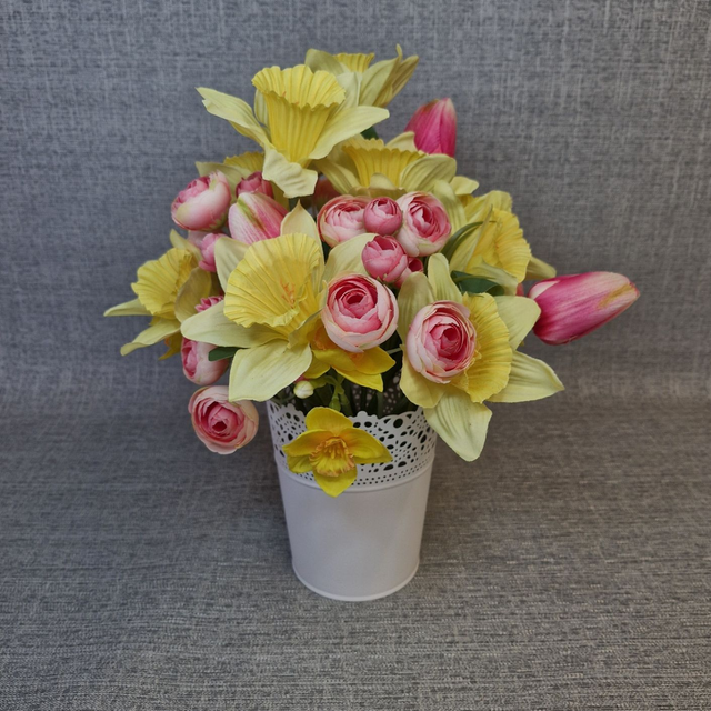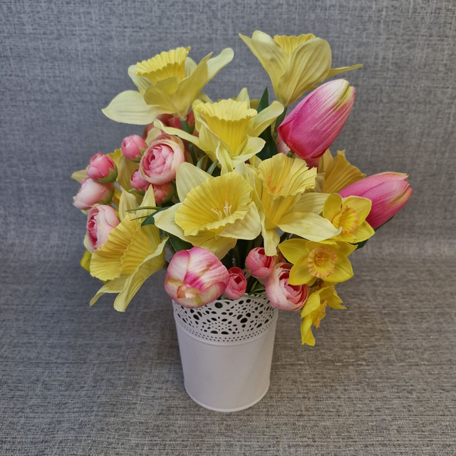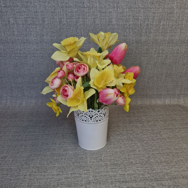 Brighten up any room with this stunning faux flower arrangement featuring vibrant pink tulips and sunny yellow daffodils. Expertly crafted from high-quality silk, these delicate blooms bring lasting beauty without the upkeep of real flowers. Displayed in a sleek white metal pot, this arrangement measures approximately 30cm wide by 35cm tall, making it the perfect size for coffee tables, sideboards, or bookcases. Ideal as a unique home décor piece or a thoughtful gift, it adds a cheerful splash of colour and elegance to any space. Designed exclusively by Flaire – Flowers by Claire, this floral centrepiece combines charm and durability for year-round enjoyment.