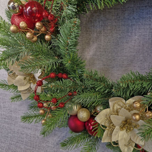 Elevate your Christmas holiday decor with this stunning artificial spruce Christmas wreath, beautifully adorned with gold poinsettias, red and gold baubles, and vibrant red and gold berries. Crafted from high-quality faux materials, this wreath offers lasting festive charm without the upkeep of real greenery. Measuring approximately 56cm, its rich colours and elegant design make it perfect for adding a warm, luxurious touch to your front door, mantel, or indoor walls. Lightweight and durable, it’s easy to hang and reusable year after year. Celebrate the season in style with this exquisite wreath that blends classic holiday traditions with modern, maintenance-free convenience. Ideal for both home and office Christmas decorating.